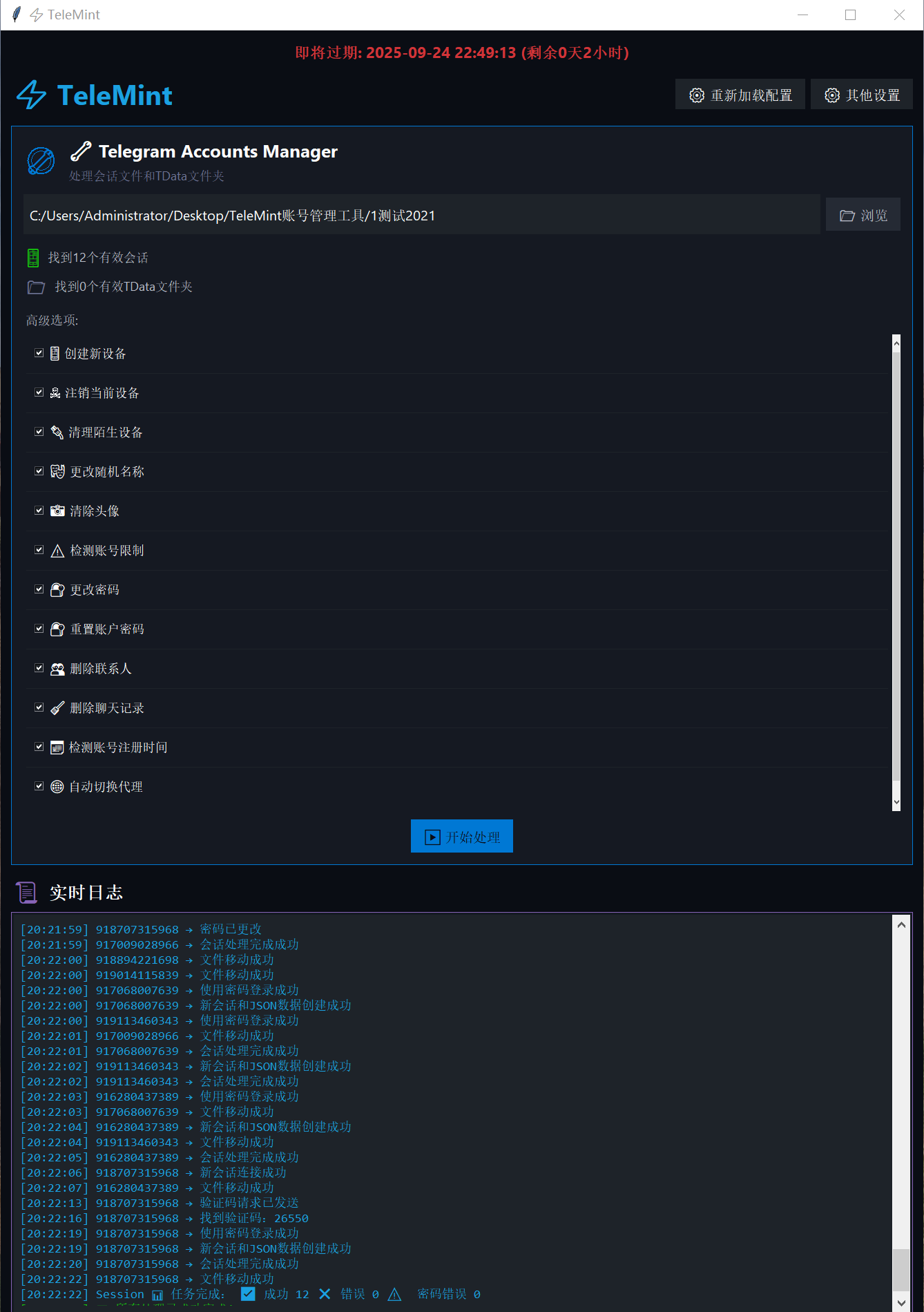 接码创建新会话、注销旧设备、清理陌生登录、更改随机名称、批量删除联系人、自动分类、智能代理切换等12大功能于一身,完美把控账号封控丨冻结丨死号率,降低新设备损耗率,助力号商高效、安全管理账号。